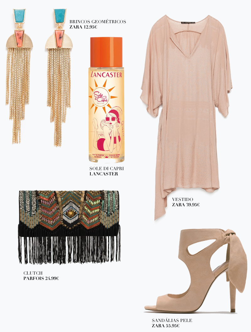 As toalhas, malas e biquinis da Oysho são sem dúvida uma perdição, sempre! Todos os anos acabo por comprar uma peça destas para acompanhar o meu verão, sem dúvida que este ano fiquei apaixonada por um saco super giro (este) e também estou de olho no futon estampado em tons de azul e para acompanhar estas idas à praia, não vai faltar certamente o perfume da Lancaster, Sole di Capri que é MARAVILHOSO. A juntar à festa, a ZARA está com peças fantásticas, nos tons que mais gosto, os tons nude e tons terra que vamos usar e abusar esta estação, dou especial destaque para os acessórios que são de inspiração boho (estes brincos meu deus, super giros) e as sandálias de pele nude que são lindas de morrer.