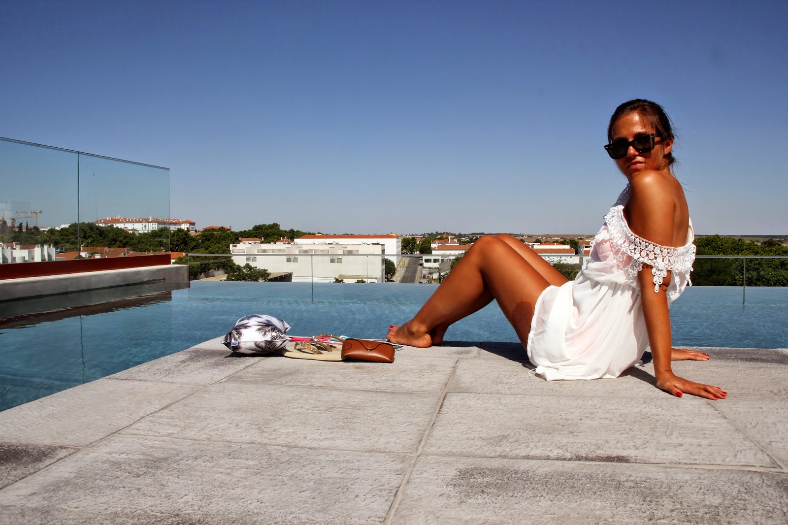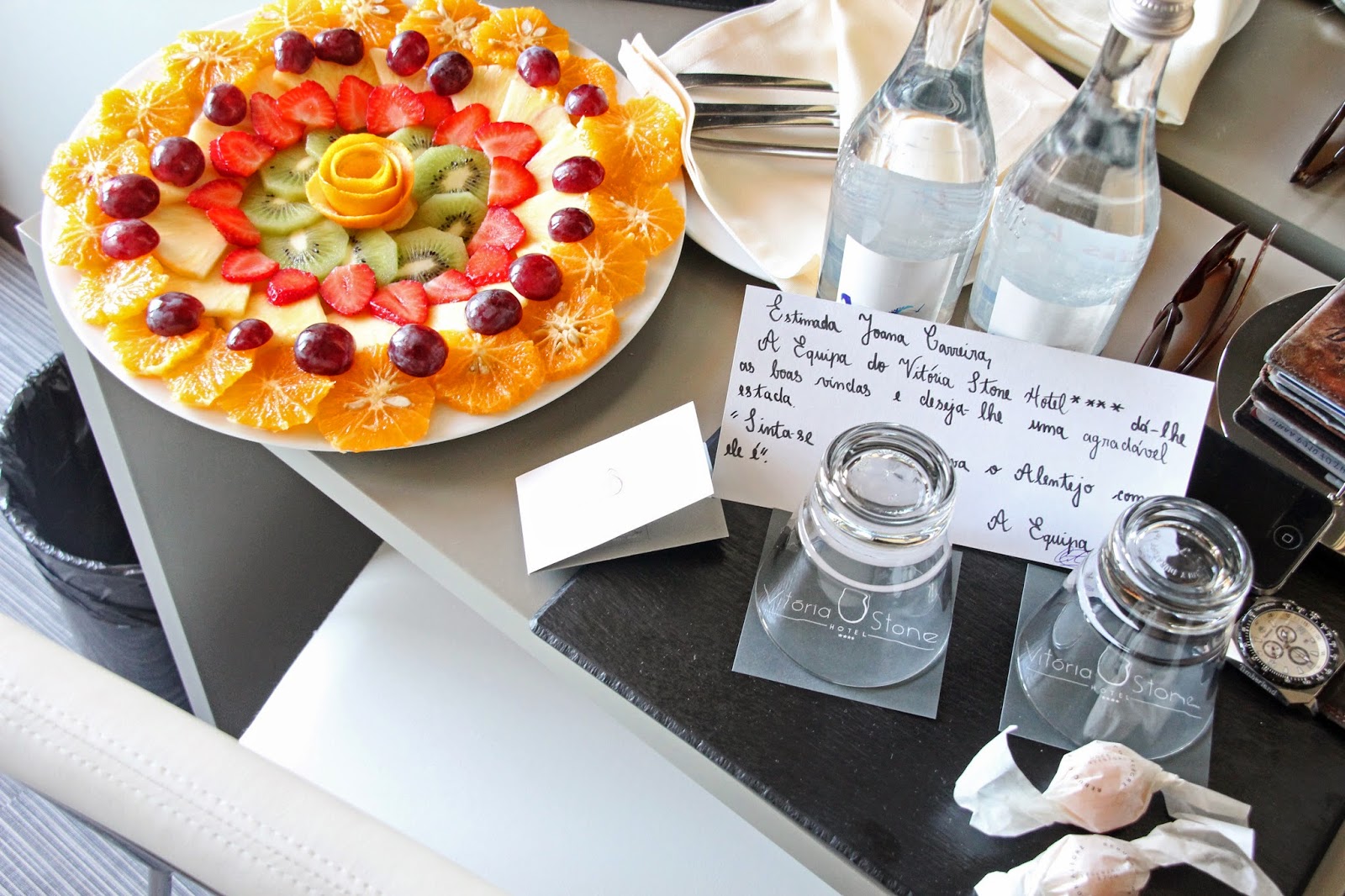 No sábado de manhã rumámos até ao Alentejo, até Évora. Antes de nos instalarmos no hotel, o Manel fez-me uma surpresa e preparou um picnic com tudo aquilo a que tinha direito, uma surpresa óptima no meio do campo para começar bem o fim-de-semana. Depois fizemos o check-in no hotel Vitória Stone, um hotel de 4 estrelas recente no centro de Évora e com uma vista fabulosa sobre a cidade. Chegámos um pouco antes da hora do check-in e tomámos uma welcome drink no lobby do hotel, super acolhedor e diferente, com uma decoração muito peculiar. Ao chegarmos, foram super simpáticos connosco, deram-nos dicas de locais a visitar, explicaram-nos todos os serviços à nossa disposição no hotel - bar, piscina, ginásio, spa, restaurante etc - e indicaram-nos o quarto.