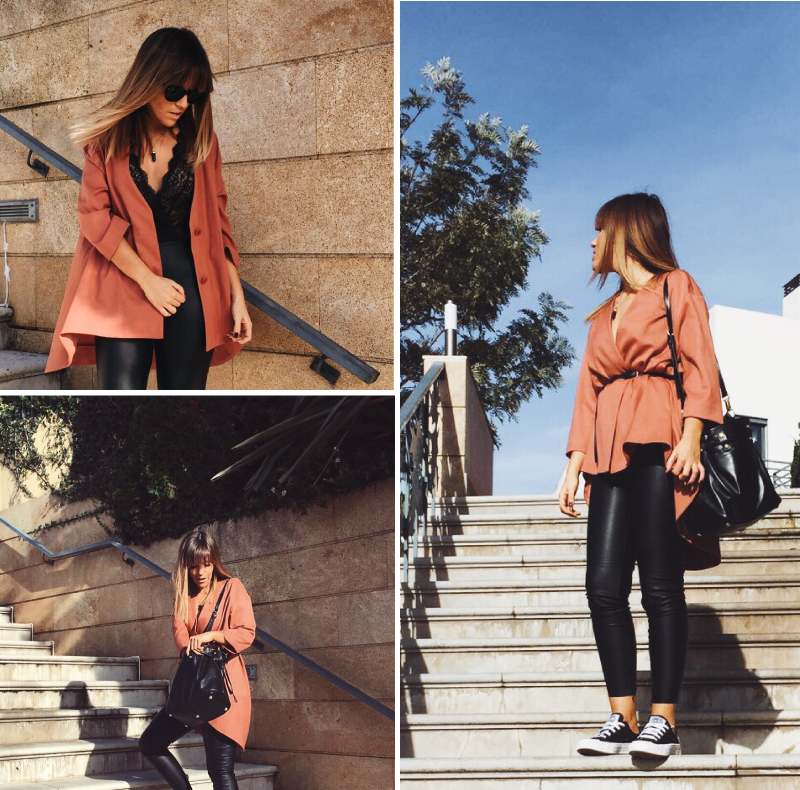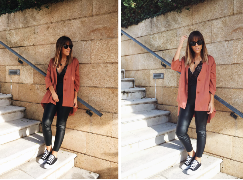 Uma das combinações de que mais gosto e que resulta lindamente é este efeito de pele em contraste com a renda e por isso mesmo usei as leggings de polipele da ZARA com o body da Oysho, para contrastar de um look mais rock para um look mais feminino e delicado. Quanto ao blazer, é da COS e foi uma das aquisições dos saldos, e que boa aquisição. Mega confortável e o facto de ser assimétrico dá logo outra dimensão ao look. Para finalizar, uns ténis claro! Os Chuck Taylor II que comprei na minha viagem aos Estados Unidos e a mala Bimba&Lola, a mais recente aquisição.