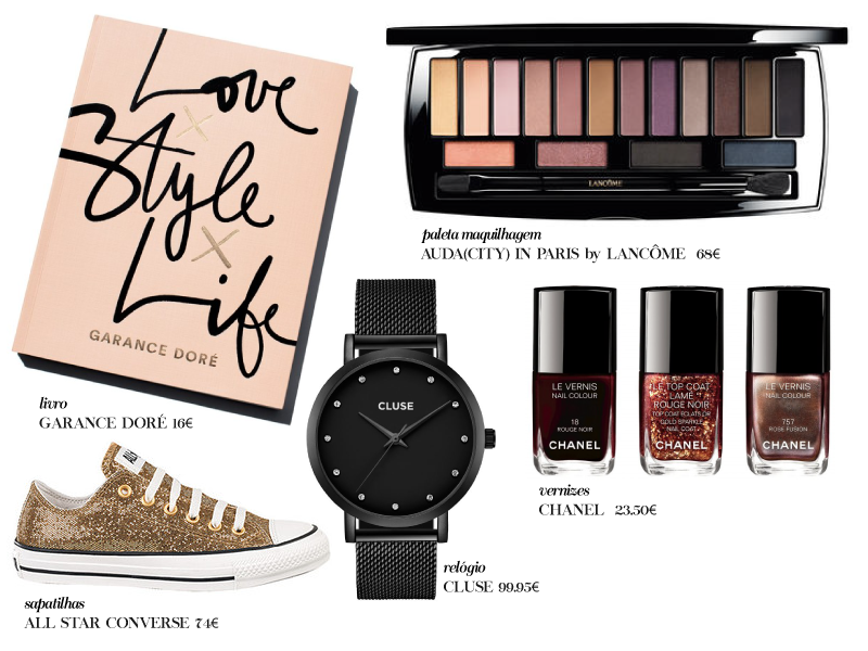 Outra coisa que está na minha wishlist é o livro da Garance Dore, Love x Style x Life que está à venda na Amazon.Uk. Podem também optar por oferecer, ou juntar à vossa lista de presentes a pedir, o livro da Vic Ceridono Bonita Todos os Dias, à venda na FNAC. Um presente que aposto que as amigas vão gostar, especialmente aquelas que adoram maquilhagem. E quem fala em maquilhagem, a colecção de vernizes da Chanel para esta época festiva está demasiado irresistível não acham? Desde os tons mais clássicos como o Rouge Noir aos metalizados como o Rose Fusion ou ao top coat festivo cheio de brilho que fica super giro por cima do Rouge Noir. Ainda dentro da maquilhagem, porque não a paleta Auda(city) in Paris da Lancôme ? Uma paleta must-have com todos os tons de sombras que precisamos, são 16 tons e conseguimos mil e uma conjugações.