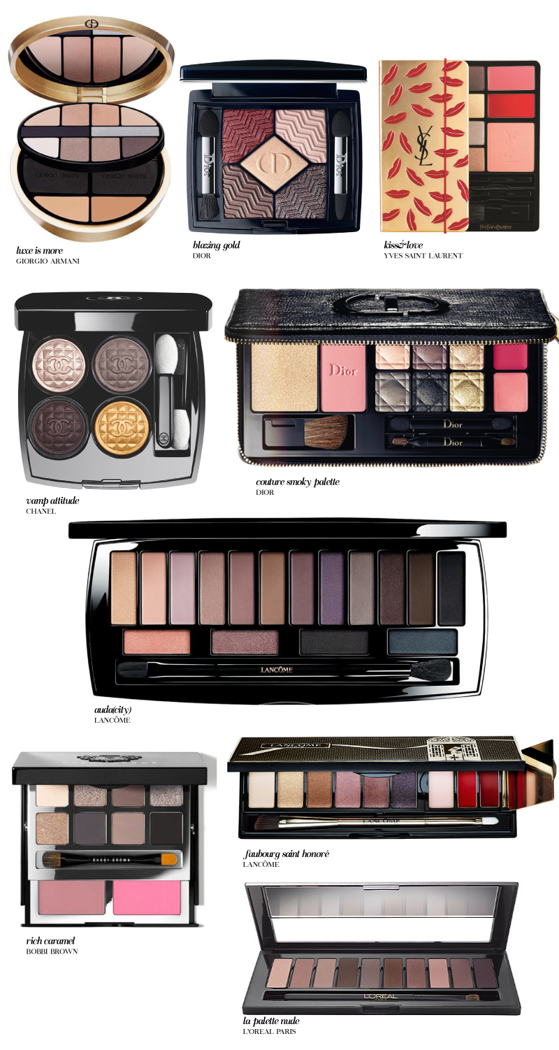 Reuni o meu top de paletas que foram lançadas para esta altura do ano e que podem ser óptimas compras. Quase todas de tons neutros e em tons que ficam lindamente em qualquer tom de olhos, desde os tons chocolate presentes na Vamp Atitude de Chanel ou na Rich Caramel de Bobbi Brown aos tons Nude da La Palette Nude da L'Oreal ou na Luxe is More de YSL. Por fim, os tons arroxeados (os meus favoritos) na Auda(city) in Paris da Lancôme, Blazing Gold da Dior ou os metalizados para as épocas mais festivas como a Faubourg Saint Honoré da Lancôme ou o Costure Smoky Palette da Dior.